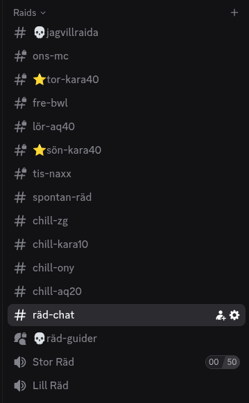 Våra event hittar du på våran discord under kategorin “Raids”. Räder markerade med ⭐ är våra huvudräder.